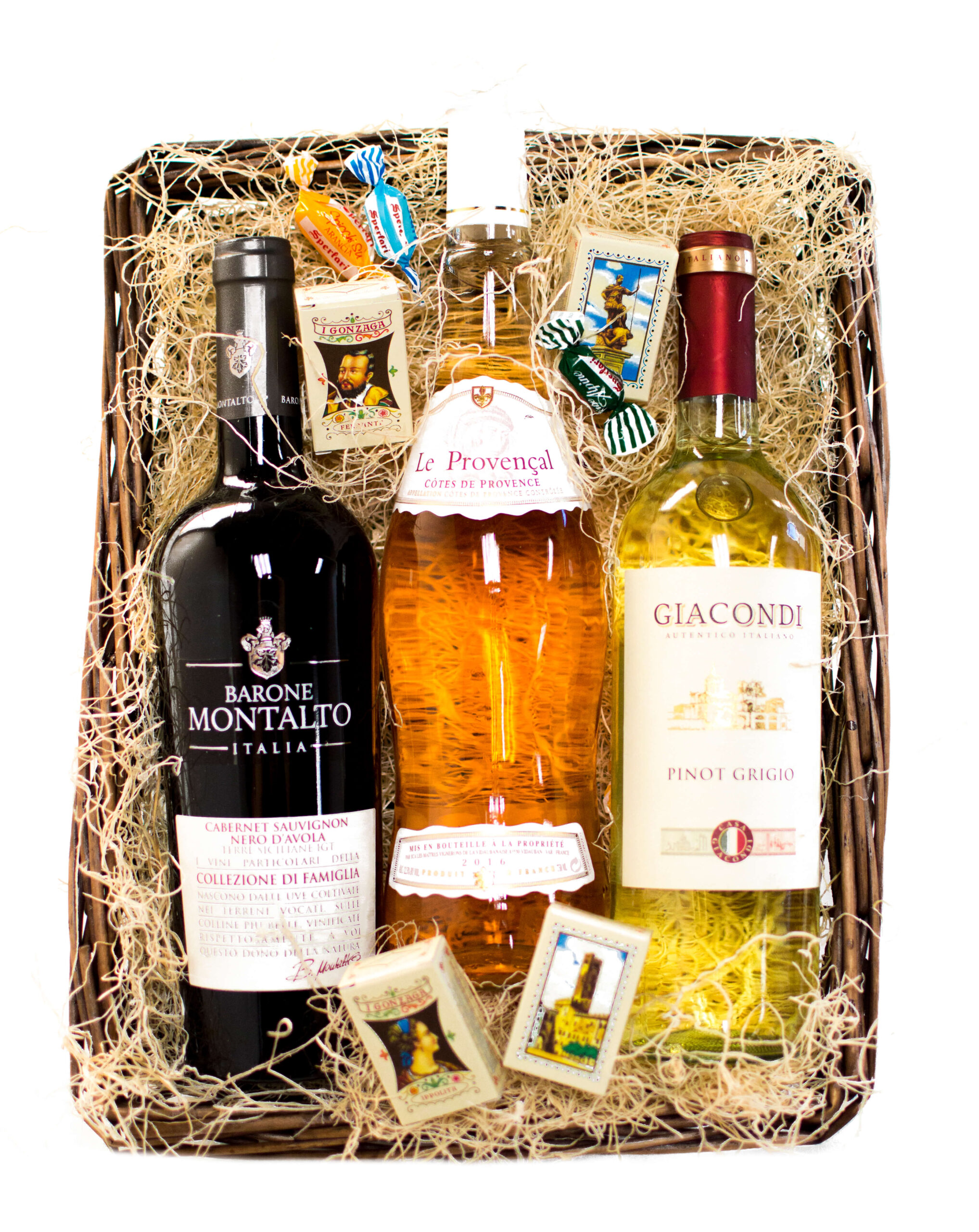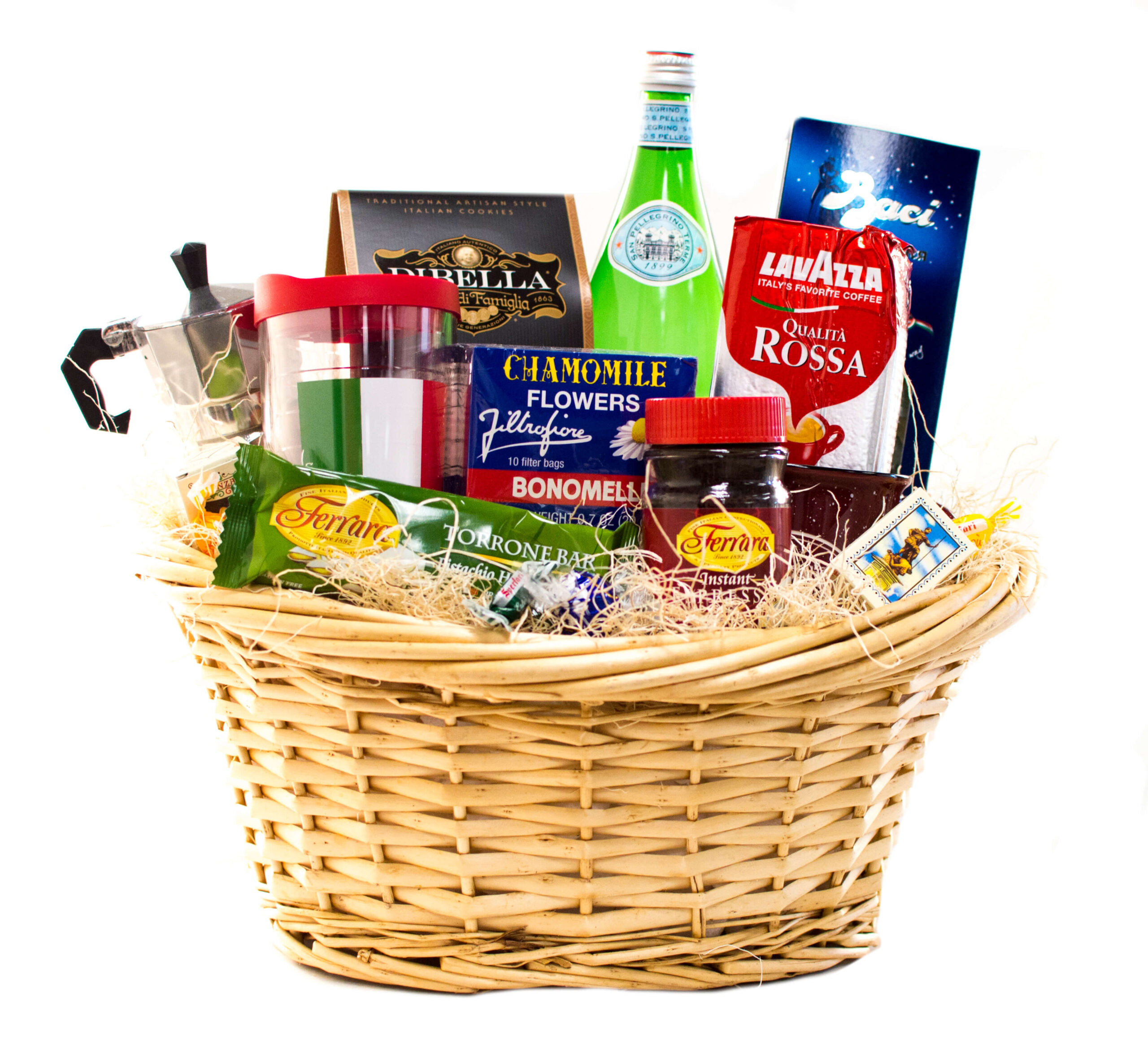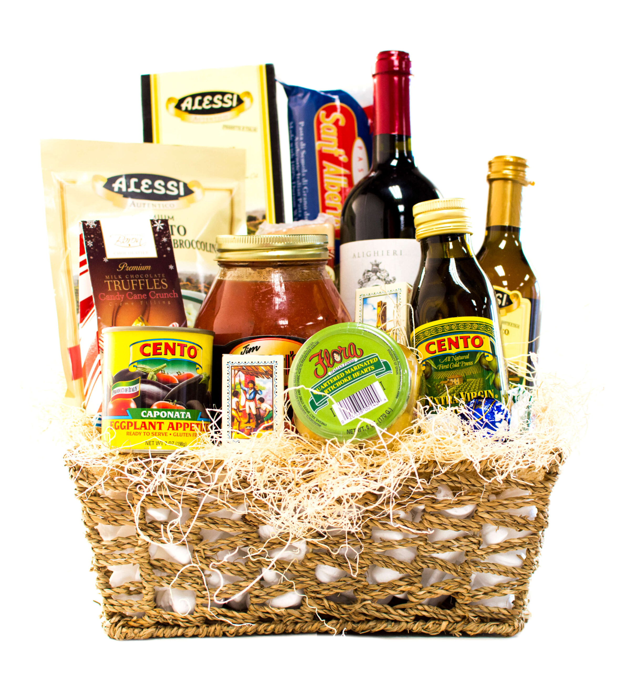 $70 – For a simple yet elegant gift, this basket includes a selection of a savory appetizer, a sweet treat, and a red or white wine. Perfect for any occasion, it’s a delightful way to share the flavors of Italy.